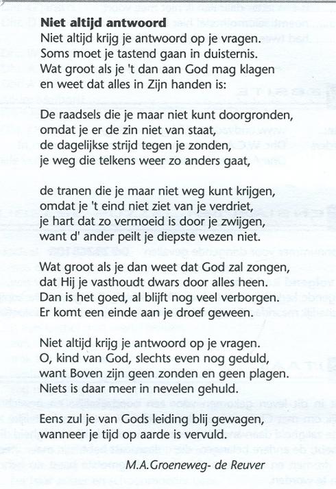 Nee, niet uw vakantie reis , maar uw levens-reis. Leeft u met God of leeft u nog zonder God ? Zomaar de vraag, waar u zelf een antwoord aan kan geven. Het doet mij een genoegen om u deelgenoot te maken van het christelijk leven. Ik hoop u wat gedichten, verzen, meditaties door te geven, waar u misschien troost, steun bij vindt of zomaar, om u te verdiepen in het christelijke geloof, en u daarom wat interressants aan te kunnen reiken. De strekking van hetgeen hier geplaatst wordt is verwant met de Reformatie en de Nadere Reformatie.
